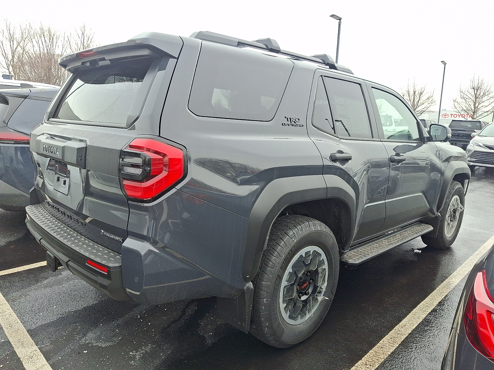 - Black honeycomb-style grille, mirror caps, door handles and overfenders; color-keyed rear spoiler; black "TRD OFF ROAD" and "4RUNNER" badges