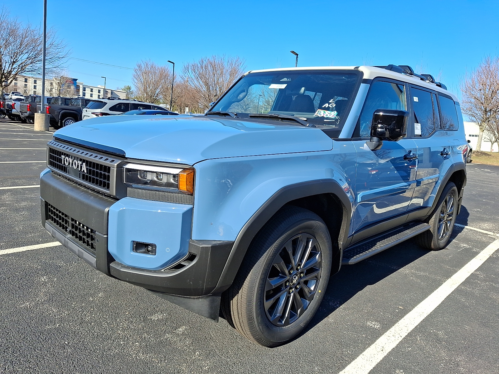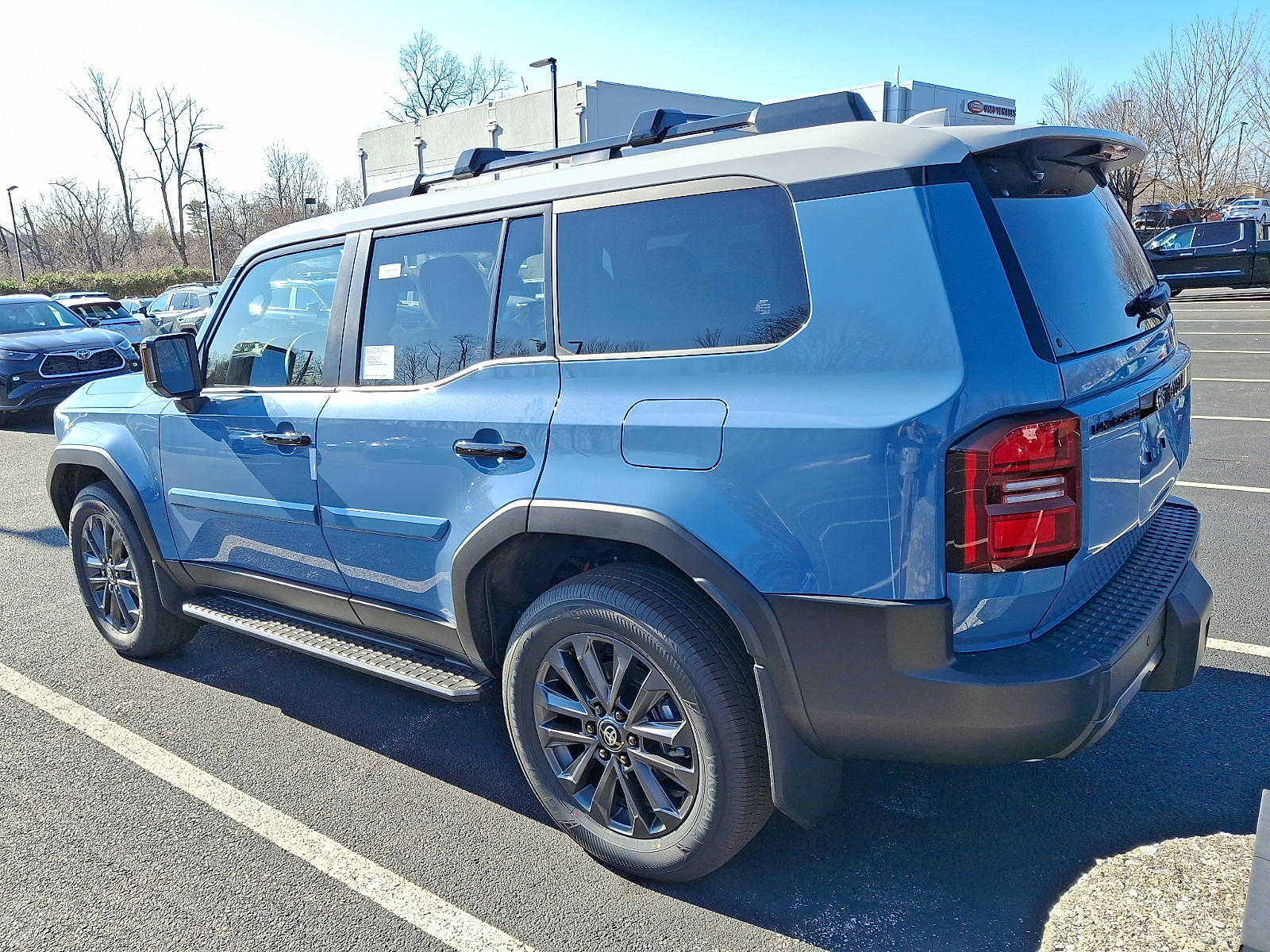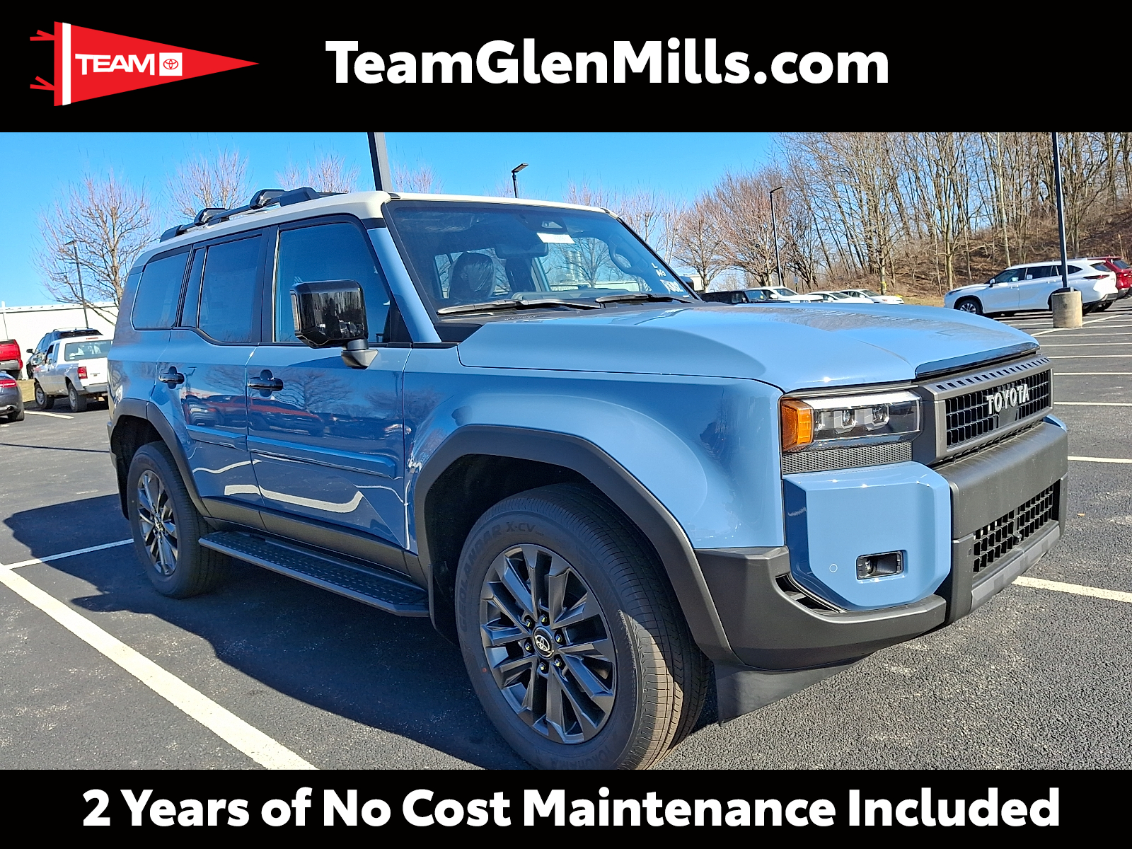Includes ToyotaCare-2 Years of Complimentary Maintenance & Roadside Assistance. Free Yearly PA State Inspection plus our TeamMate Rewards program gives you 20% back in the form of reward points for every dollar spent in our service department. Each point is worth $1 and may be used towards future vehicle service, future vehicle purchases, accessories, and tires. We want you to be Part of the Team! 20-in. Alloy Wheels - Includes 265/70R18 Tires,Tires: P265/70HR18 AS BSW front and rear tires, Body side moldings help protect against careless door swings and other parking lot mishaps while adding a little extra exterior style. .Color-matched to the exterior paint finish .Body side moldings follow the lower door styling lines to enhance the vehicle exterior, Engineered to precisely fit your vehicle, all-weather cargo mats are made from durable, flexible, weather-resistant material that cleans easily. .Precise injection molding uses Toyota's original vehicle design data for a perfect fit .Liners feature ribbed channels to better hold moisture .Skid-resistant backing helps keep the mat in place, Federal Emissions - Includes Emissions: LEV3-ULEV50 emissions,Emissions tiers: Tier 3 Bin 50 emissions, Help prevent door edge dings and chipped paint with this protective finishing touch. . Thermoplastic-coated stainless steel is precisely color matched to the exterior paint . Blend seamlessly to complement exterior styling, Land Cruiser Premium Package - 14-speaker JBL Premium Audio including Subwoofer & Amp, Illuminated Entry, Power Moonroof w/Sunshade, Digital Rearview Mirror, Leather-Trimmed Memory Driver's Seat, Power Front Seats, Head-Up Display (HUD), Lane Change Assist (LCA), Front Cross-Traffic Alert (FCTA), Digital Key (req. Remote Connect Trial/Subscription) and Traffic Jam Assist (req. Drive Connect Trial/Subscription). 1yr Trials included, 4G Network Dependent. - Includes Pre-Collision System,Forward collision warning: Toyota Safety Sense (TSS) 3.0 forward collision mitigation,Driver attention monitor: Vehicle Sway Warning driver attention alert with active monitoring,Power Tilt/Slide Moonroof W/Power Sunshade,Leather Seat Trim,Front seat upholstery: Leather front seat upholstery,Rear seat upholstery: Leather rear seat upholstery,14-Speaker Premium JBL Audio,Speakers: JBL speakers,Amplifier,Speakers number: 14 speakers,Head-Up Display (HUD),Lane Keeping System,Autonomous cruise control: Lane Tracing Assist (LTA) hands-off cruise control with lane change,Autonomous cruise control: Lane Tracing Assist (LTA) hands-on cruise control with lane change,Electric Interior Rear View Mirror,Side Step & Step Cover,Front Cross Traffic Alert,Blind Spot Monitor W/Lane Change Assist,8-Way Power Seats,Driver seat direction: Driver seat with 8-way directional controls,Passenger seat direction: Front passenger seat with 8-way directional controls,Memory settings: Memory settings include: door mirrors and steering wheel,Number of memory settings: 2 memory settings,Power driver seat controls: Driver seat power reclining, lumbar support, cushion tilt, fore/aft control and height adjustable control,Power passenger seat controls: Passenger seat power reclining, cushion tilt, fore/aft control and height adjustable control,Digital Key Capability, Liftgate Light - Includes LED Back Door Lamp W/Power Back Door, Long-wearing, fade resistant carpet floor mats help keep your carpet neat and clean. .Precisely engineered to fit your vehicle's floor .Skid-resistant backing and quarter-turn fasteners help secure mat in position .Land Cruiser logo on the front mats adds a customized touch .Second row carpet floor mats accommodate Land Cruiser's seating configurations, Rear Bumper Guard - Includes Back Door Opening Guard, Roof Cross Bars help carry additional cargo. . Includes mounting screws that attach to fittings in the roof rails .Aerodynamic styling to help minimize wind noise .Can support 165 lbs. of dynamic load when weight is evenly distributed across both bars .Set of two black bars - Includes Roof rack: Full roof rack,Maximum roof rack load: 165 lbs. maximum roof rack load,Roof rails, Stabilizer Disconnect Mechanism 2026 Toyota Land Cruiser Heritage Blue w/Grayscape Roof 2.4L Hybrid Turbo I4 326hp 465ft. lbs. 8-Speed Shiftable Automatic 4X4 22/25 City/Highway MPG 2026 Cars.com SUV of the Year: Nominee 12V power outlets: 1 12V power outlet, 2.4L Hybrid Turbo I4 326hp 465ft. lbs., 20-IN. ALLOY WHEELS - INCLUDES 265/70R18 TIRES,TIRES: P265/70HR18 AS BSW FRONT AND REAR TIRES, 3-point seatbelt: Rear seat center 3-point seatbelt, 4WD type: Full-time 4WD, 4X4, 8-Speed Shiftable Automatic, ABS Brakes: 4-wheel antilock (ABS) brakes, ABS Brakes: Four channel ABS brakes, Accessory power: Retained accessory power, Adaptive cruise control: Full-Speed Range Dynamic Radar Cruise Control (DRCC), Air conditioning: Yes, All-in-one key: All-in-one remote fob and ignition key, Alternator Type: Hybrid electric motor alternator, Antenna: Diversity antenna, Antenna: Window grid and roof mount audio antenna, Armrests front center: Front seat center armrest, Armrests rear: Rear seat center armrest, Auto door locks: Auto-locking doors, Auto headlights: Auto on/off headlight control, Auto high-beam headlights: Automatic High Beams (AHB) auto high-beam headlights, Automatic brake hold, Automatic curve slowdown cruise control: Proactive Driving Assist (PDA) - Deceleration Assist Automatic curve slowdown cruise control, Basic warranty: 36 month/36,000 miles, Battery charge warning, Battery run down protection, Battery type: Lead acid battery, Beverage holders rear: Rear beverage holders, Beverage holders: Front beverage holders, Body panels: Fully galvanized steel body panels with side impact beams, BODY SIDE MOLDINGS HELP PROTECT AGAINST CARELESS DOOR SWINGS AND OTHER PARKING LOT MISHAPS WHILE ADDING A LITTLE EXTRA EXTERIOR STYLE. .COLOR-MATCHED TO THE EXTERIOR PAINT FINISH .BODY SIDE MOLDINGS FOLLOW THE LOWER DOOR STYLING LINES TO ENHANCE THE 