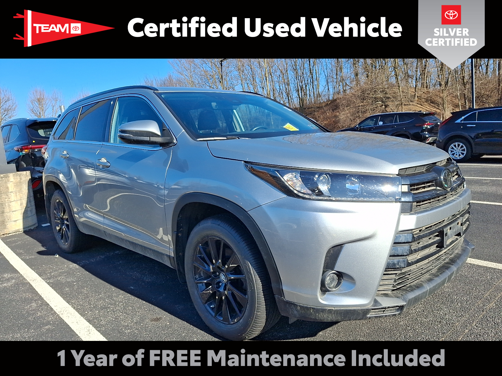 Includes One Year Complimentary Maintenance & Roadside Assistance. Free Yearly PA State Inspection plus our TeamMate Rewards program gives you 20% back in the form of reward points for every dollar spent in our service department. Each point is worth $1 and may be used towards future vehicle service, future vehicle purchases, accessories, and tires. We want you to be Part of the Team. 2019 Toyota Highlander SE Celestial Silver Metallic Black w/Silver Stitching 50 State Emissions, 8 In. Infotainment Screen Size, All-Weather Floor Liners Package, Aluminum Alloy Wheels, Heated Driver Seat, Heated Passenger Seat, Leather-trimmed Upholstery, Power Glass Moonroof / Sunroof, Power Operated Rear Trunk/liftgate, Push-button Start, Touch Screen Display Navigation System 3.5L V6 295hp 263ft. lbs. 19/26 City/Highway MPG 2019 Automotive Science Group Best Brands, 2019 Kelley Blue Book Best Family Cars, 2019 Kelley Blue Book Best Resale Value: Brand, 2019 Kelley Blue Book Best Resale Value: Mid-Size SUV/Crossover, 2019 Kelley Blue Book Best Three-Row SUVs for Families, 2019 The Car Book Best Bet: Mid-Size SUV, 2019 Vincentric Best CPO Value in America: Passenger Car Brand https://www.teamtoyotaglenmills.com/ Includes: Silver Certified vehicles have passed a comprehensive 135-point inspection conducted by factory-trained technicians to ensure they meet the highest performance and safety standards. Each Silver Certified vehicle includes a 12-month/12,000-mile limited powertrain warranty, and one year of roadside assistance. A complimentary CARFAX Vehicle History Report is also provided.